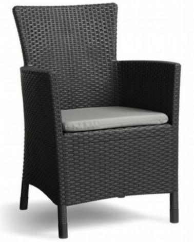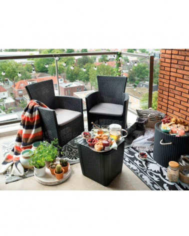 Conjunto Iowa da Keter composto por duas cadeirões, duas almofadas cinzas e uma mesa de arrumação.