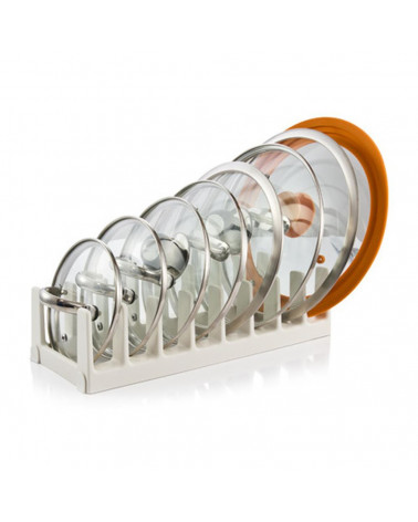 Suporte para tampas com 8 compartimentos. Ideal para tampas entre os 14 cm e 32 cm de diâmetro.