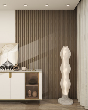 Painel ripado Kaza Maestoso PS 3D em poliestireno expandido, tonalidade natural, ideal para revestimento de paredes com efeito tridimensional. Leve e resistente, proporciona um toque moderno e sofisticado a qualquer ambiente. Dimensões: 2700x122x20 mm (0,329 m²).