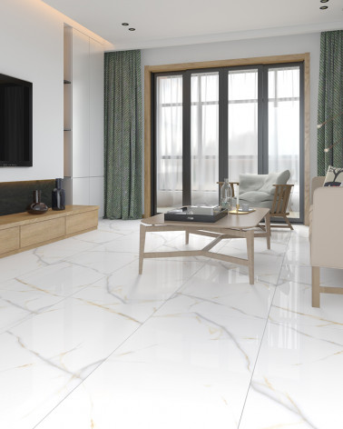 Com um acabamento polido que realça o estilo mármore, este pavimento é perfeito para quem procura dar um toque de elegância aos ambientes interiores.